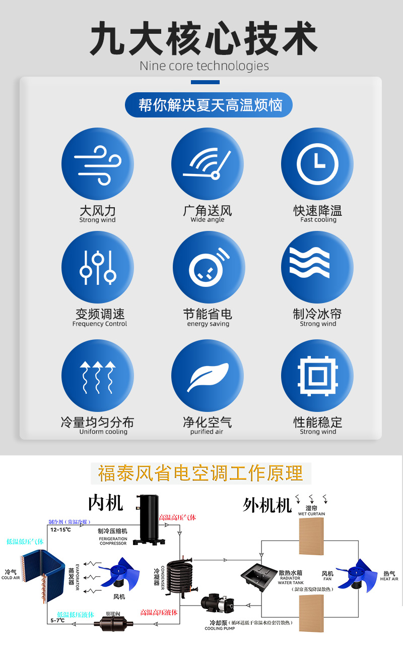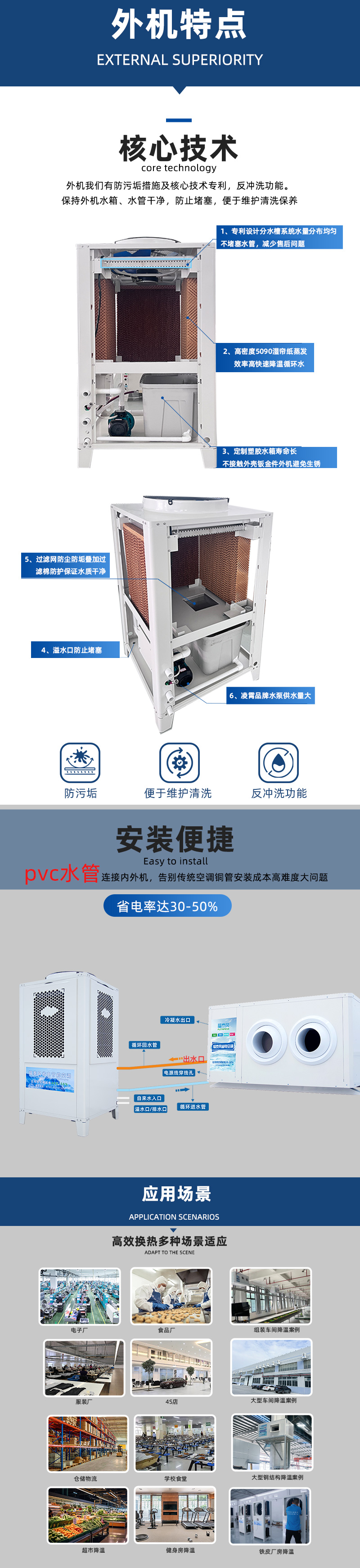 .節能省電、同等面積安裝比傳統空調省電30~50%,覆蓋面積大一臺5P的可以覆蓋200個平方車間降溫,出風口溫度可以做到13-16度。車間溫度可做到20-26度適合人體體感溫度。