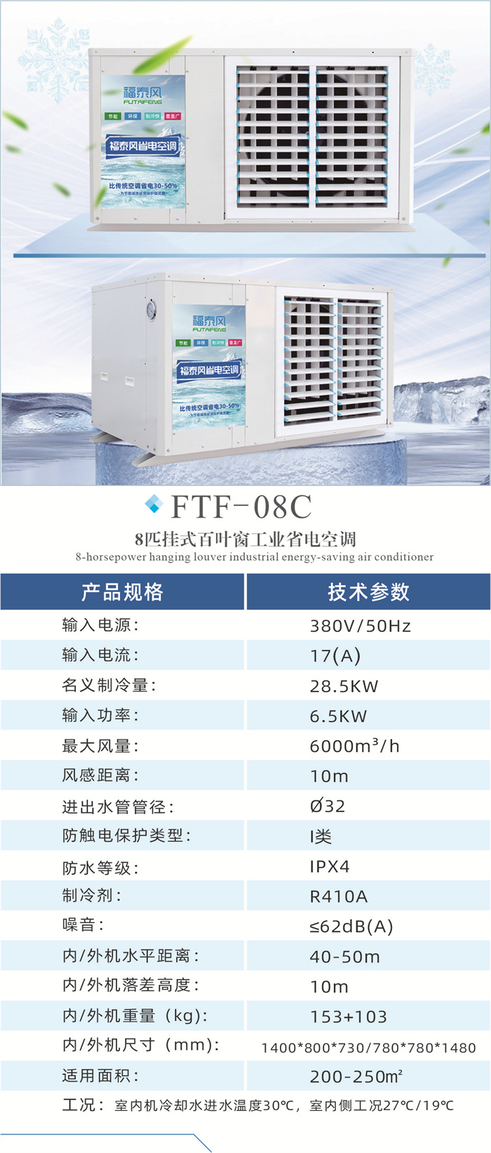 .節能省電、同等面積安裝比傳統空調省電30~50%,覆蓋面積大一臺5P的可以覆蓋200個平方車間降溫,出風口溫度可以做到13-16度。車間溫度可做到20-26度適合人體體感溫度。
